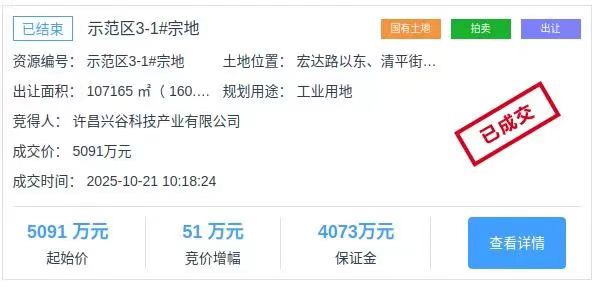 10月21日,高新区3-1#宗地在省土地使用权网上交易系统完成出让。该宗地位于宏达路以东,清平街以北,怡和街以南,隆泰路以西。用地性质为工业用地,总面积107165平方米,成交价5091万元。该宗地由许昌兴谷科技产业有限公司竞得并投资建设,计划总投资约2.3亿元。据了解,此地块将用于建设汽车零部件产业园项目,以汽车绿色能源研发装配制造为主,采用标准化厂房形式,满足企业入驻需要。目前,自然资源和规划分局正与竞得企业积极对接,加快推进国有建设用地使用权合同签订、规划编制指导等工作,进一步创新土地供给,激发工业发展新活力,有效保障产业项目落地实施。
