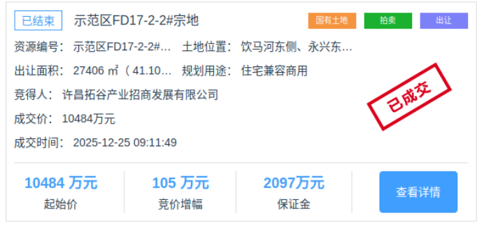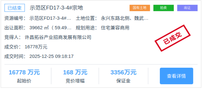 其中,FD17-2-2#宗地位于饮马河东侧、永兴东路北侧(永兴路与魏武大道交叉口西北角区域),出让面积 27406平方米,土地用途为商住混合用地,成交价10484万元。FD17-3-4#宗地位于永兴东路北侧、魏武大道西侧(永兴路与魏武大道交叉口西北角区域),出让面积 39662 平方米,土地用途为商住混合用地,成交价16778万元。该两宗地均由许昌拓谷产业招商发展有限公司竞得并投入建设。